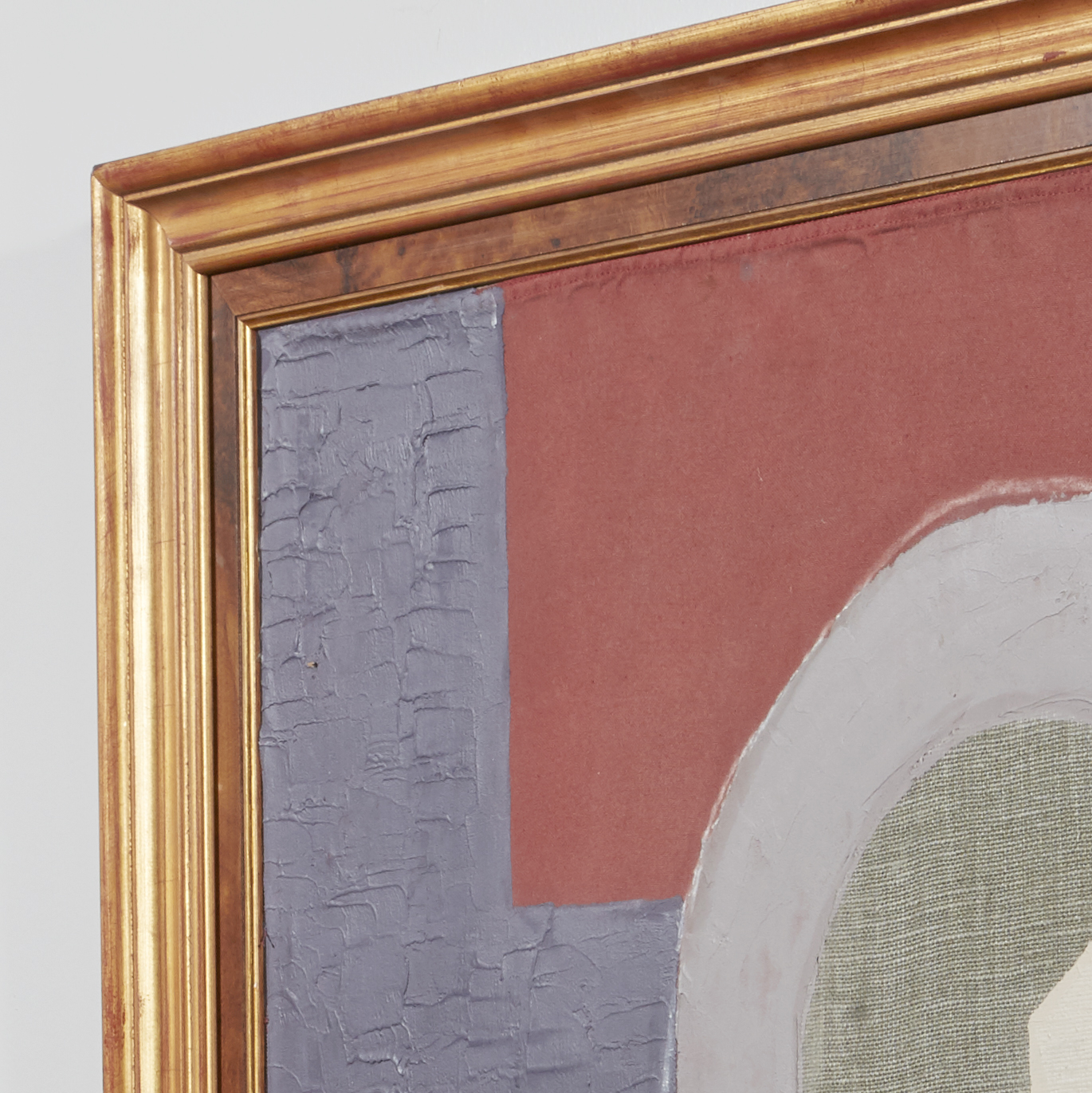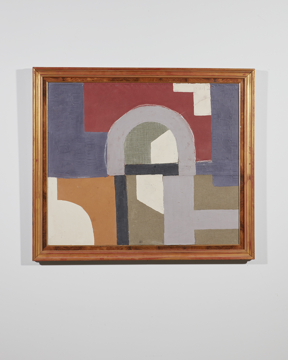 A framed textile collage by artist Raoul Morren, made in 2023. The abstract composition of organic shapes is composed with a palette of earthy ochre, and neutral hues inflected by violet highlights. Designed to be displayed with any orientation.