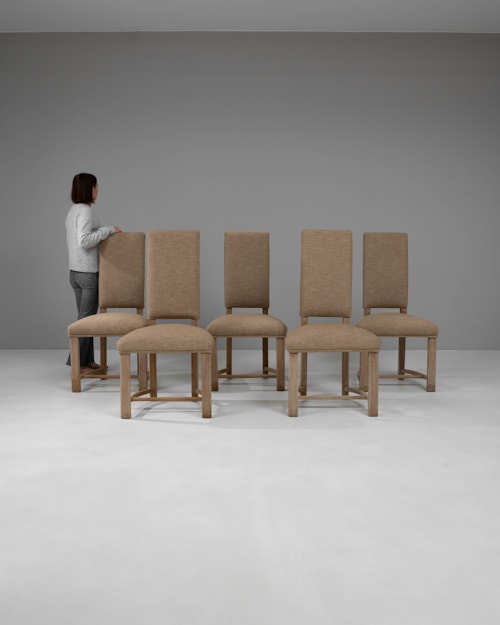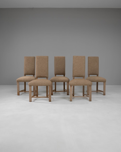 Set Of Six Oak Brutalist Dining Chairs With Upholstered Seats