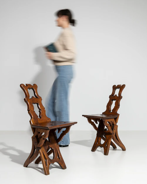 More info About Pair of Brutalist Upholstered Armchairs with Carved Details![]()