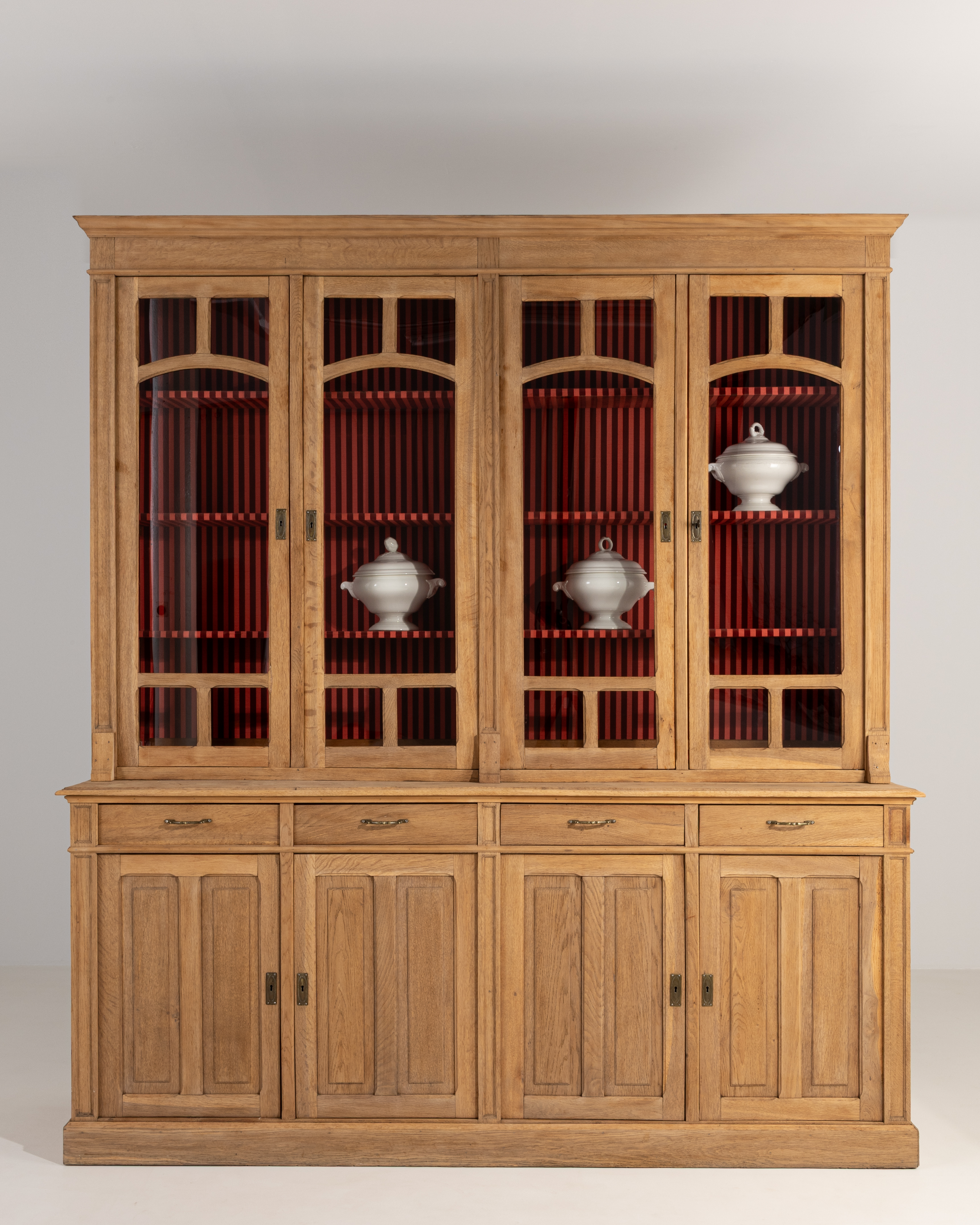 Oak Vitrine With Red Striped Interior Lining