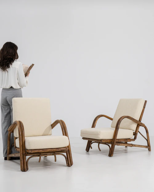 Pair Of Faux Bamboo Reclining Armchairs With Bouclé Upholstery